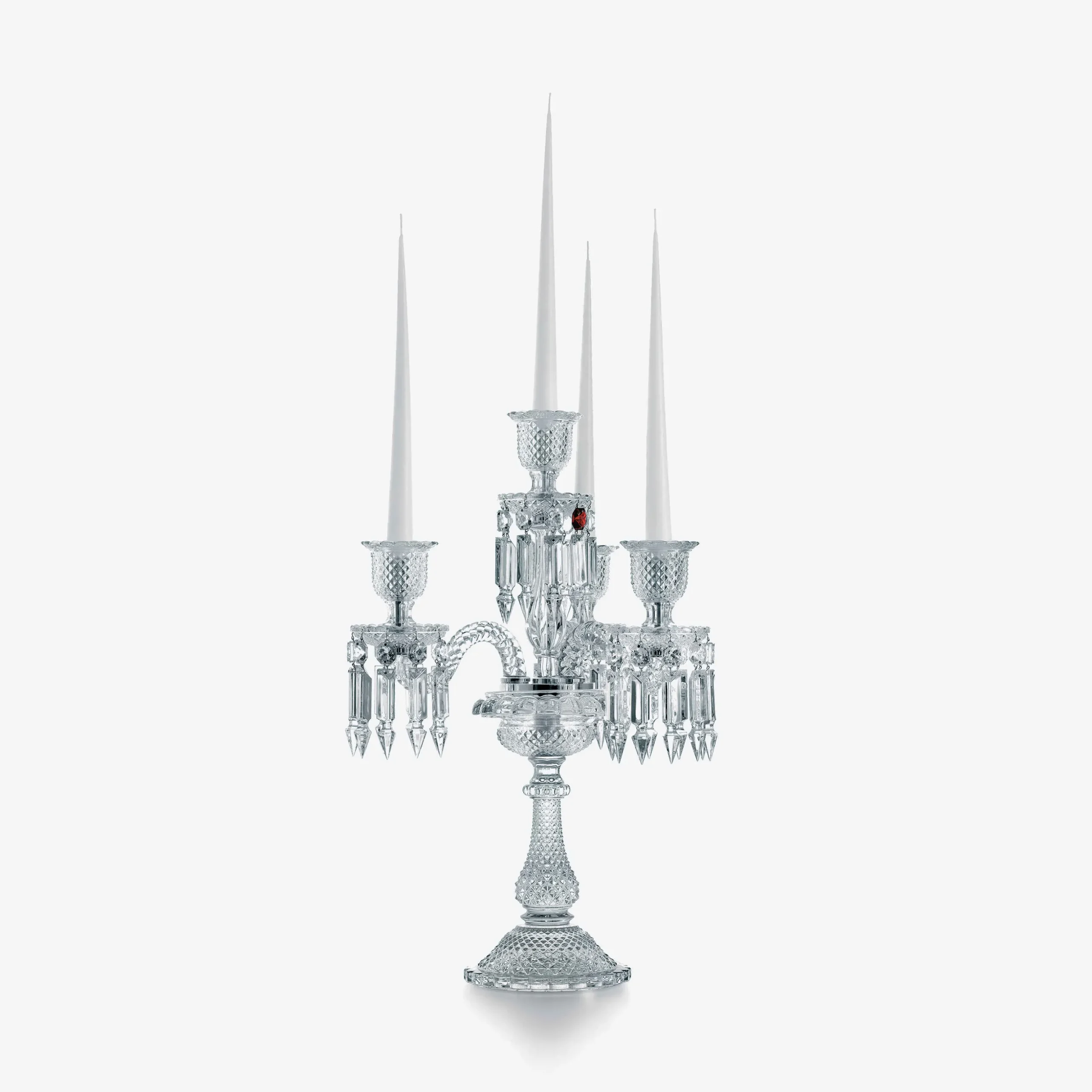 Le candélabre Zénith est orné de cristaux taillés géométriquement, parmi lesquels apparaît discrètement le cristal octogonal rouge emblématique de Baccarat. La collection Zénith collection, créée à la fin du XIX ème siècle, est l’une des collections les plus emblématiques de Baccarat en ce qui concerne les luminaires.La base en aluminum laqué est solide et, tout en protégeant le cristal des secousses, donne au candélabre une touche d’éclat moderne. Le candélabre Zénith est disponible en deux modèles à deux ou quatre bougies (les bougies sont vendues à part). Des abat-jours en verre peuvent être ajoutés pour accentuer l’éclat.Philippe Starck a revisité la collection Zénith en cristal onyx, qui s’est avérée aussi séduisante en cristal noir qu’en cristal clair.