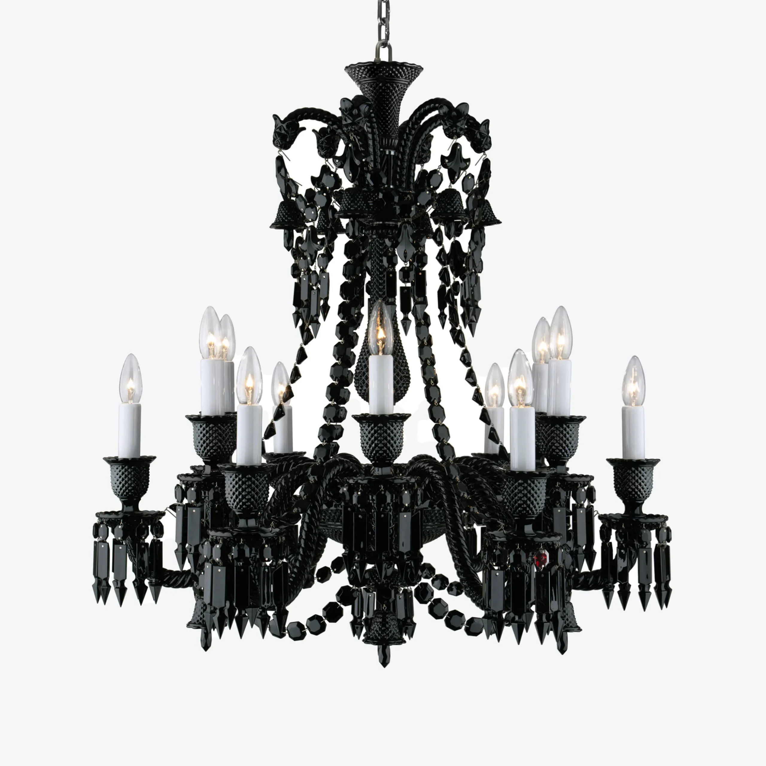 Philippe Starck garde la structure et l’ornementation du lustre Zénith mais innove en cristal noir, magnifiant la lumière par l’ajout d’abat-jour à réflecteurs en aluminium. L’octogone de cristal rouge emblématique de Baccarat est suspendu à un prisme à dard, signé Starck. La surprise vient du cristal noir, « anti-lustre » par excellence, aux antipodes de la transparence du cristal clair : il dynamise les qualités sculpturales de cette forme classique pour en révèler le potentiel inattendu. Superbe et généreux feu d’artifice de cristal noir, véritable objet décoratif, ce lustre de 24 lumières s’admire comme une éblouissante sculpture.