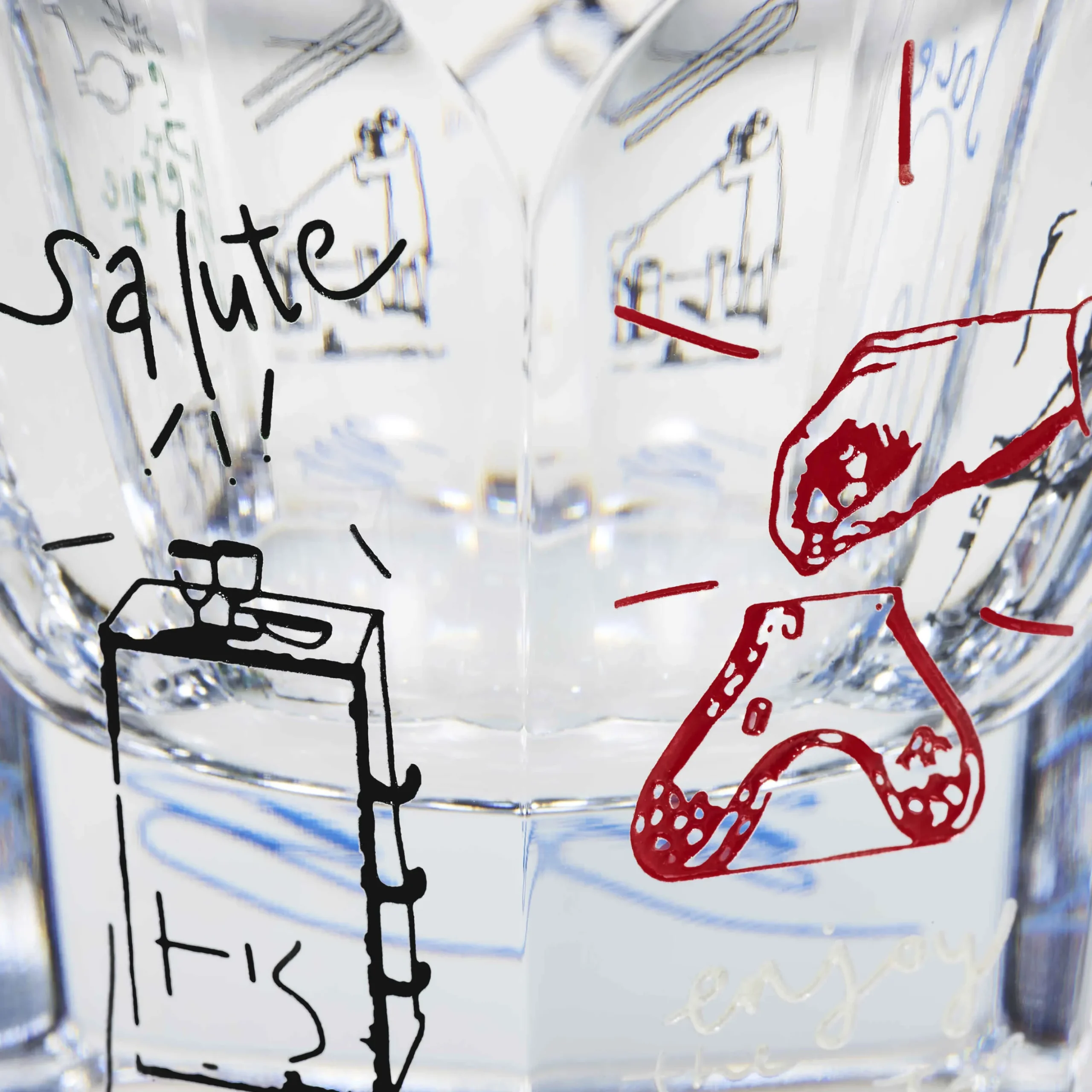 Harry Nuriev revisite le gobelet et la carafe Harcourt, ainsi que la boule de cristal Sirius, en utilisant le même langage graphique que celui employé pour l’installation de l’entrée de la Maison Baccarat. Harcourt, icône de Baccarat, et Sirius, symbole de la pureté du cristal, deviennent de nouveaux moyens d’expression artistique à travers son regard. Dans les ateliers de dorure de la Manufacture, les artisans donnent vie à sa vision en gravant et en émaillant, en noir ou en couleur, des mots tels que « salut », « savourez l’instant », « célébration », « charme », ainsi que des motifs et des représentations de gestes symboliques de l’univers Baccarat. Entre héritage et réinvention, Harry Nuriev célèbre la liberté créative de la Maison et rend hommage au savoir-faire de son collectif, rendant l’émotion visible et précieuse.