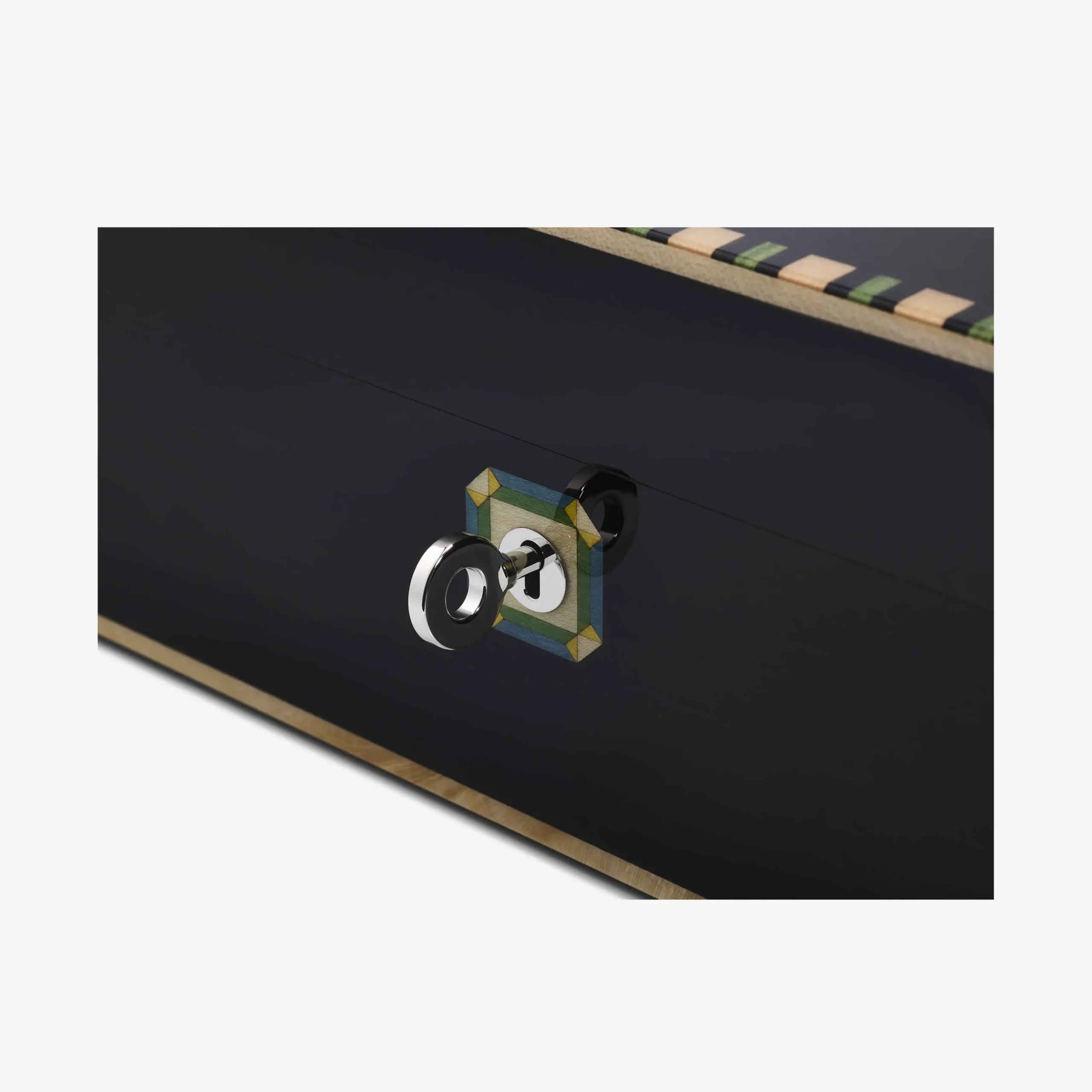 Avec la cave à cigares Louxor, Baccarat célèbre l’art du fumoir et perpétue son héritage dans la création d’objets pour amateurs de cigares depuis le XIXème siècle. Inspirée de la collection emblématique Louxor de Baccarat, la cave à cigares s’habille d’un décor évoquant la richesse sculpturale du cristal taillé. Réinterprétation contemporaine de l’Égypte antique et de son architecture, Louxor fusionne pointes de diamant, biseaux et lignes verticales, à travers un jeu de facettes aux allures de pyramides infinies. Ce motif signature prend une nouvelle dimension, transposé en marqueterie de bois. Composé de 395 pièces, le décor de la cave à cigares déploie une palette lumineuse : bleu, vert, jaune et noir se mêlent dans une composition d’une rare complexité. Chaque élément, minutieusement appliqué à la main, révèle une précision artisanale d’exception. Grâce à une régulation précise de l’humidité et de l’obscurité, elle assure une conservation optimale des cigares. Conçu pour accueillir jusqu’à 75 cigares, cet écrin prestigieux associe savoir-faire d’excellence et design contemporain, au service des rituels les plus raffinés. Réalisée en édition limitée et numérotée à 50 exemplaires, la cave à cigares Louxor prolonge l’art de vivre Baccarat dans l’univers du fumoir, en parfaite résonance avec celui du bar et de la dégustation.
