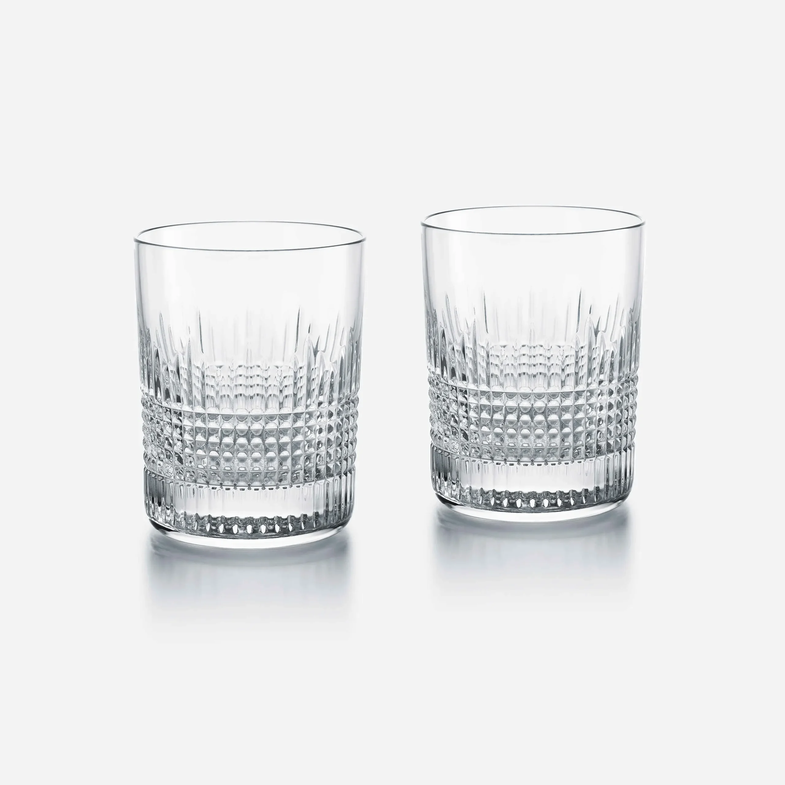 Le gobelet cristal clair Baccarat, modèle Nancy, se caractérise par le motif de croisillons gravé à sa base. La rigueur géométrique des croisillons en relief à la base du verre et le poli parfait de sa partie supérieure concourent à l’équilibre de la ligne. Traversé par la lumière, le relief de cristal clair ajoute des reflets intenses au contenu du verre. Nancy est la collection des passionnés de cocktails créatifs et amateurs de whiskies rares.