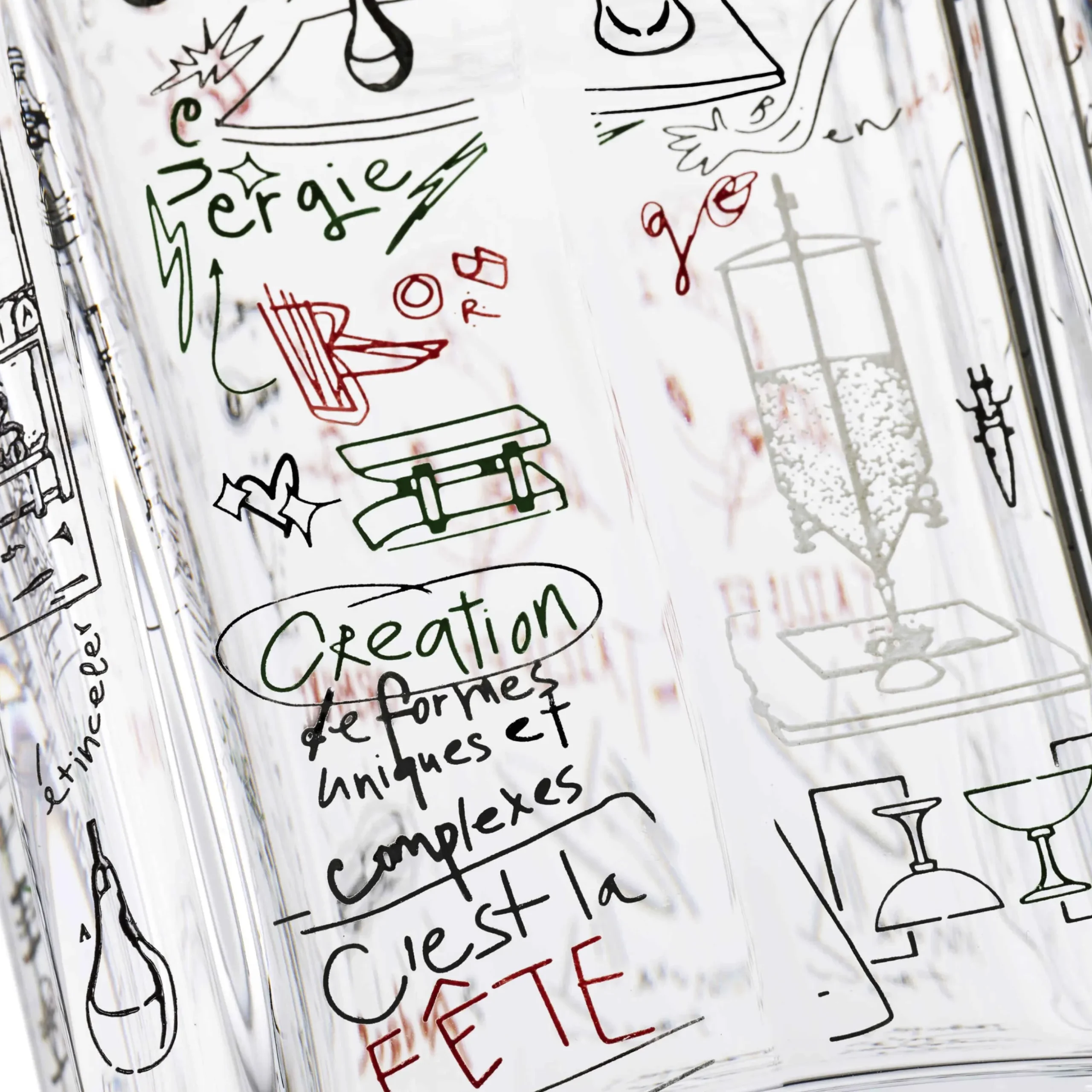 Harry Nuriev revisite le gobelet et la carafe Harcourt, ainsi que la boule de cristal Sirius, en utilisant le même langage graphique que celui employé pour l’installation de l’entrée de la Maison Baccarat. Harcourt, icône de Baccarat, et Sirius, symbole de la pureté du cristal, deviennent de nouveaux moyens d’expression artistique à travers son regard. Dans les ateliers de dorure de la Manufacture, les artisans donnent vie à sa vision en gravant et en émaillant, en noir ou en couleur, des mots tels que « salut », « savourez l’instant », « célébration », « charme », ainsi que des motifs et des représentations de gestes symboliques de l’univers Baccarat. Entre héritage et réinvention, Harry Nuriev célèbre la liberté créative de la Maison et rend hommage au savoir-faire de son collectif, rendant l’émotion visible et précieuse.