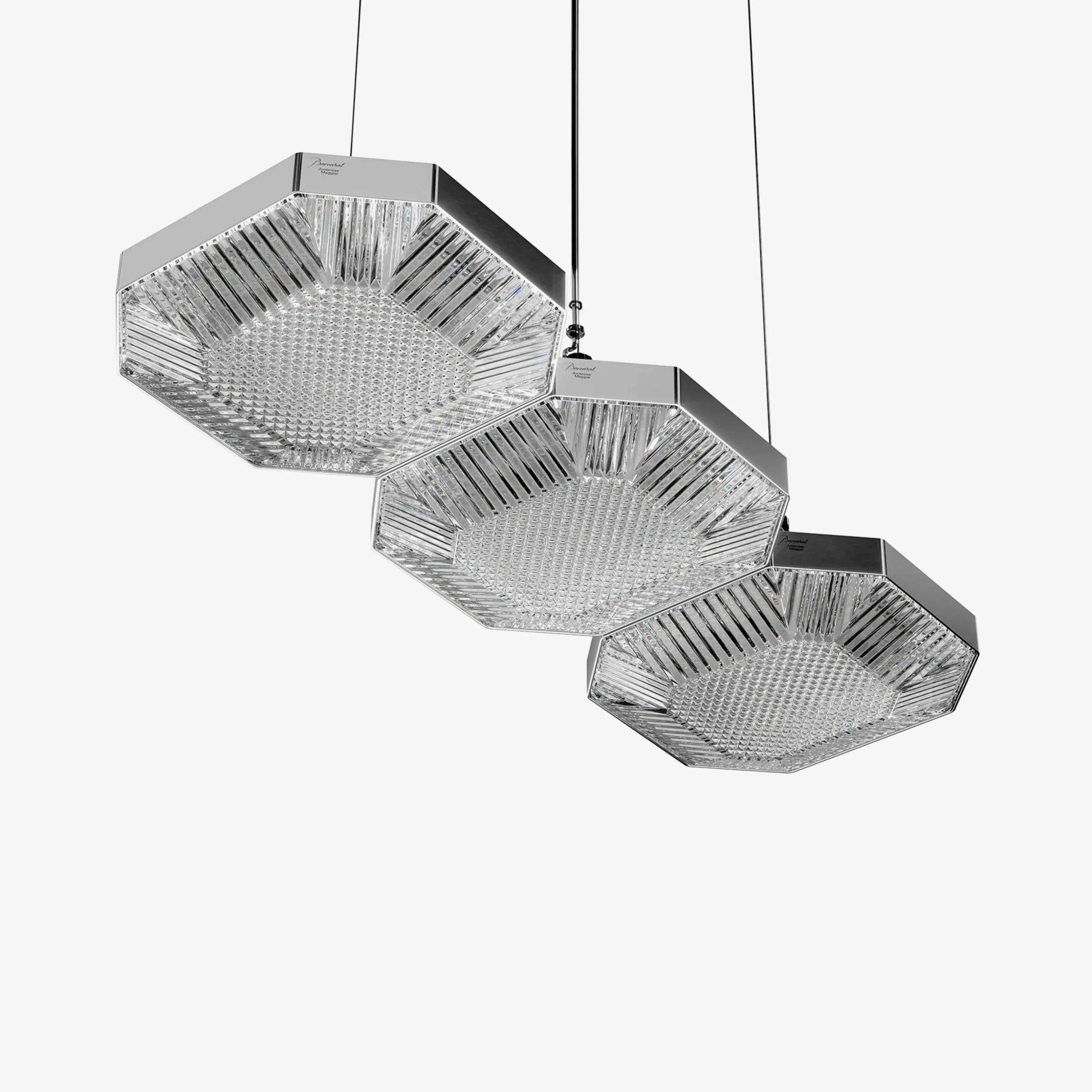 « Octogone est un geste architectural qui célèbre un patrimoine, celui de la maison Baccarat.Un passage du terrestre au céleste, à travers lequel la brillance et la pureté du cristal sont transcendés par la lumière.» Ambroise MaggiarAvec la collection de luminaires Octogone, imaginée par Ambroise Maggiar, Baccarat réinvente l’un de ses symboles iconiques : la pampille octogonale, signature de ses lustres depuis des générations. Designer aux multiples talents, Ambroise Maggiar, conjugue sensibilité poétique et rigueur méthodique pour créer des œuvres singulières fusionnant héritage et innovation. Minimaliste et avant-gardiste, la collection Octogone célèbre la créativité et offre une modularité infinie. Pensée pour s’adapter à chaque espace, elle invite à une liberté d’assemblage ludique. Suspension, applique ou plafonnier, en version 1 lumière ou 3 lumières, les éléments s’assemblent à l’envi, donnant naissance à des compositions personnalisées. Chaque pièce, taillée de subtils motifs, sculpte la lumière et dévoile un jeu de reflets captivant. Associé au cristal, le métal poli miroir souligne la silhouette octogonale de la collection dans un contraste saisissant.Née au XIXème siècle, la pampille octogonale de Baccarat traverse le temps et se réinvente. Transformée en luminaire, elle embrasse le XXIème siècle avec audace, incarnant un art de vivre résolument contemporain.Grâce à l’application Casambi, disponible sur smartphone, il est possible d’ajuster l’intensité et la température des LED pour créer des ambiances sur-mesure.